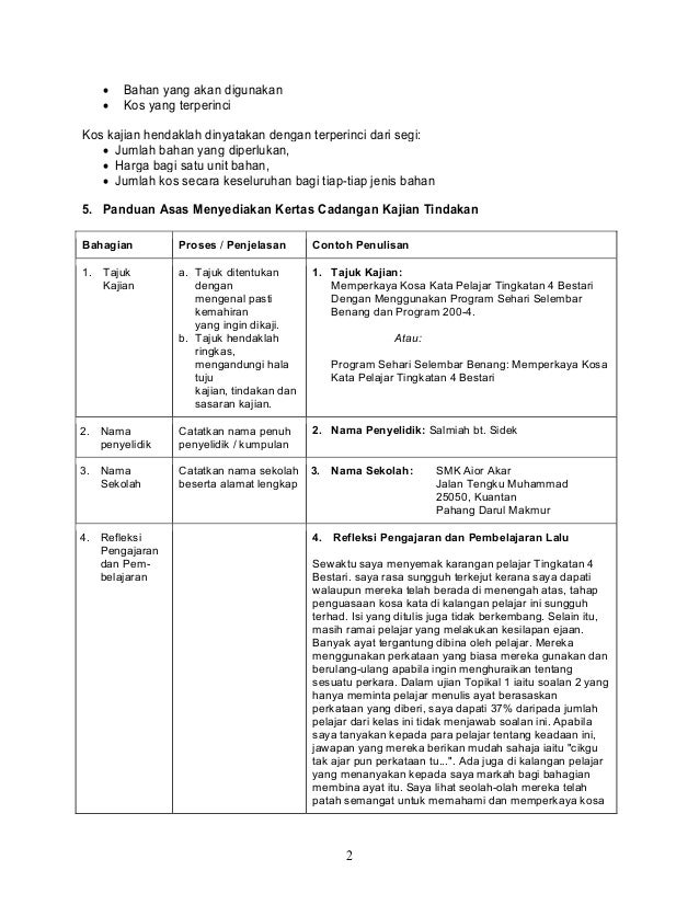 Di dalam pendahuluan untuk kertas cadangan kajian tindakan, boleh dimasukkan. Publish at scribd or explore others. Meningkatkan kemahiran menulis karangan menggunakan teknik jumbakpek berpandukan kad piramid karangan pelbagai. Membuat pencarian bahan dan ulasan. Minit mesyuarat, kertas kerja, latihan dan rekod markah. Sampel kajian tindakan artikel 1: 28 5.0 cadangan tindakan 5.1 perancangan tindakan pengkaji bercadang untuk menggunakan model kurt lewin (1948) dalam menjalankan kajian jenis bahan jumlah x harga seunit 1 kertas a4 2 x rm 12 rm 24 2 dakwat printer 4 x rm 15 rm 60 perakam suara sony walkman 3 1 x rm 200. Meningkatkan prestasi mata pelajaran pengajian am dalam kalangan 20 orang pelajar tingkatan 6r1. Ujian lisan bagi mengesan tahap 26 ogos 2016 7. Cadangan mini kajian tindakan refleksi dari kumpulan lain cadangan mini kajian tindakan kumpulan kami ialah: Panduan mudah kaedah kajian kuantitatif. Contoh kertas cadangan kajian tindakan. Download lagu kertas cadangan kajian tindakan mp3 dapat kamu download secara gratis di metrolagu.
